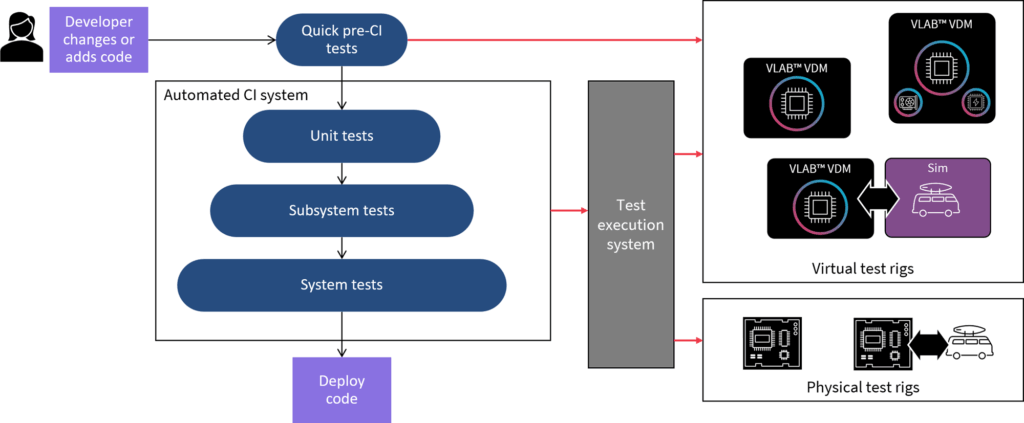 Virtualization for software development and testing is a key supporting technology for SDVs. You cannot depend on hardware rigs for software testing – they are never available in sufficient amounts, or early enough, or flexible enough. Automotive software developers need to be able to run and test code as soon as it is built, and this can only be realized by using virtualization, i.e., by simulating both the computer systems as well as the environment in which it is operating.
