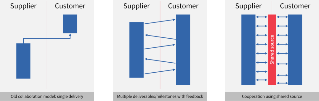 Instead, as illustrated above, a more agile model can be used where a supplier sends a series of deliverables to the customer and gets feedback to guide the next delivery. This is better, but it still suffers from some friction. In the extreme, we might see companies working together in shared source code repositories.