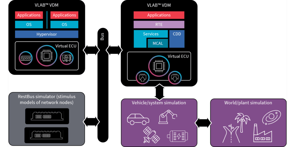 VLAB is commonly used to virtualize the ECU hardware for such setups, allowing the target software to run as-is, interacting with a simulation of the vehicle and the world in which it operates. The virtual test rigs complement the physical test rigs, allowing testing at scale without using physical test rigs except for final testing before release.